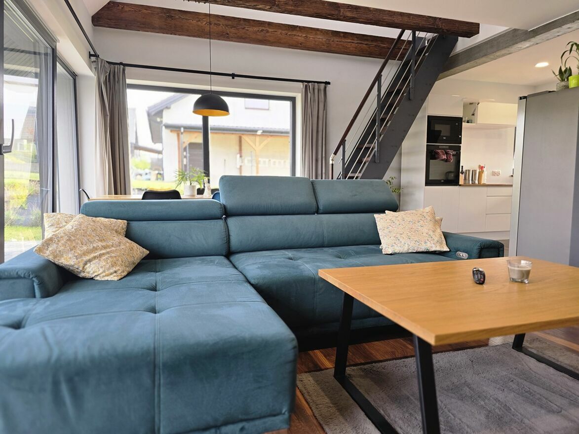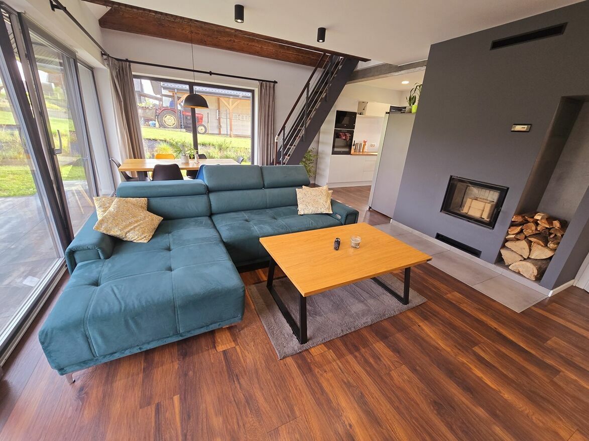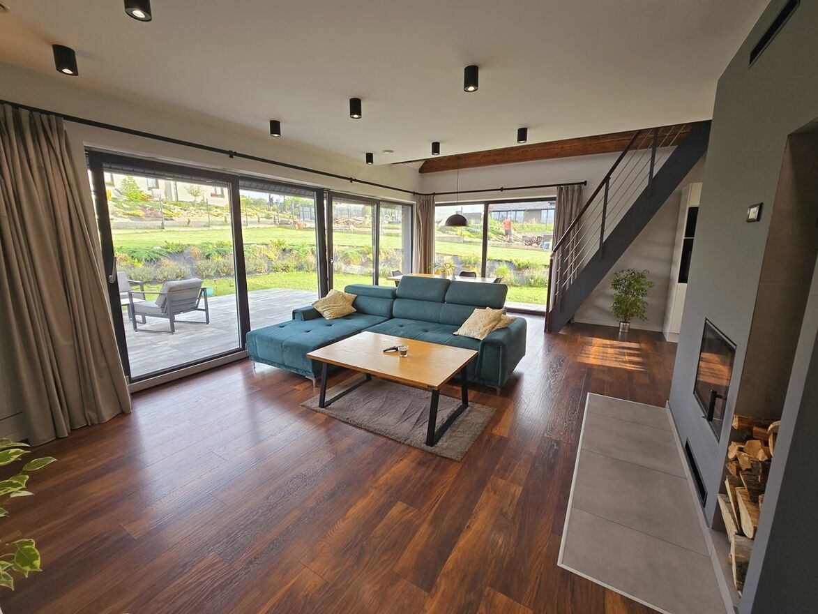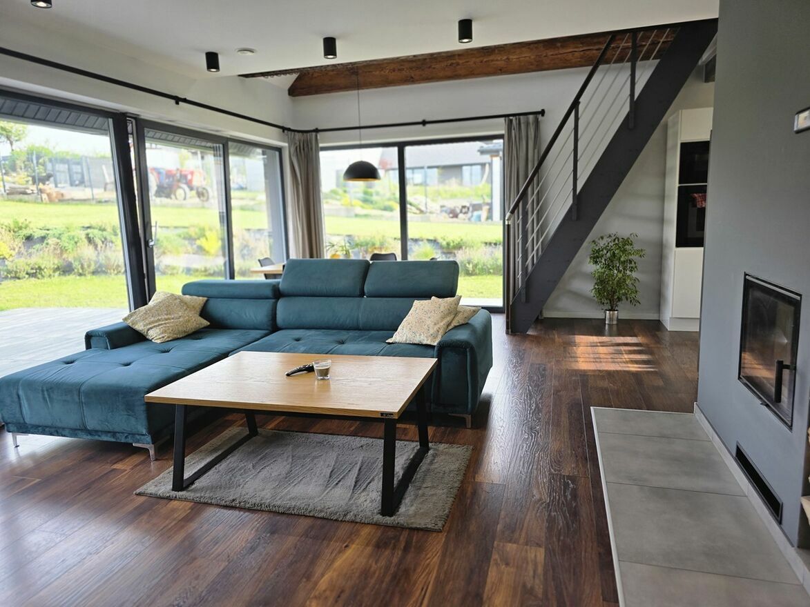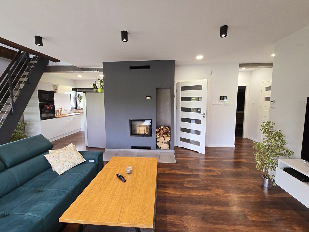 Wyposażony w fotowoltaikę i rekuperację mechaniczną a także kominek z płaszczem wodnym zabudowany z podwójnej płyty ogniowej.