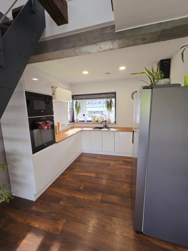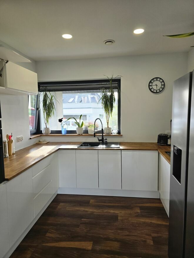 Kuchnia umeblowana w kolorze białym z blatem drewnianym dębowym.