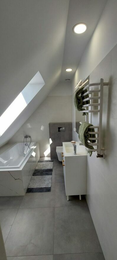 Na poddaszu są 2 osobne pokoje, łazienka z wanną oraz miejsce na zrobienie garderoby i otwarty hol, miejsce do wykorzystania.