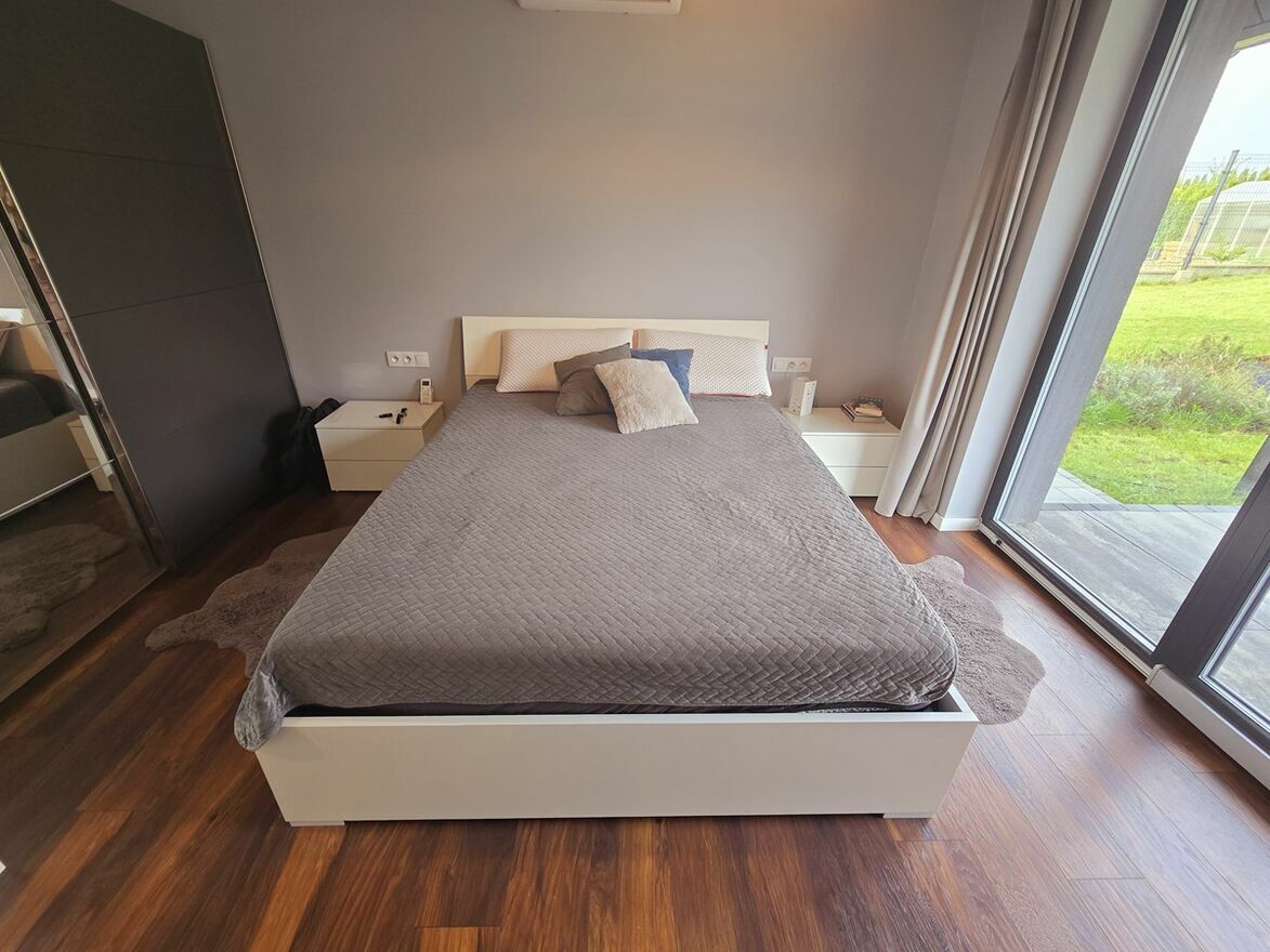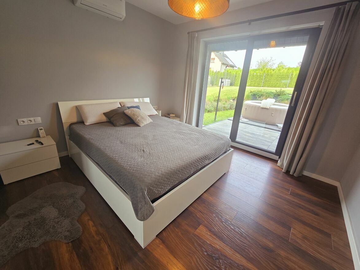 Sypialnia z wyjściem na taras, duże przeszklenia, widok na działkę.