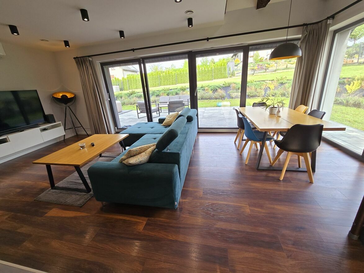 Salon z dużymi oknami z wystawą w kierunku wschodnim i na południe. Taras 40m2 wyłożony płytami betonowymi. Okna PCV 3-szybowe Roto.